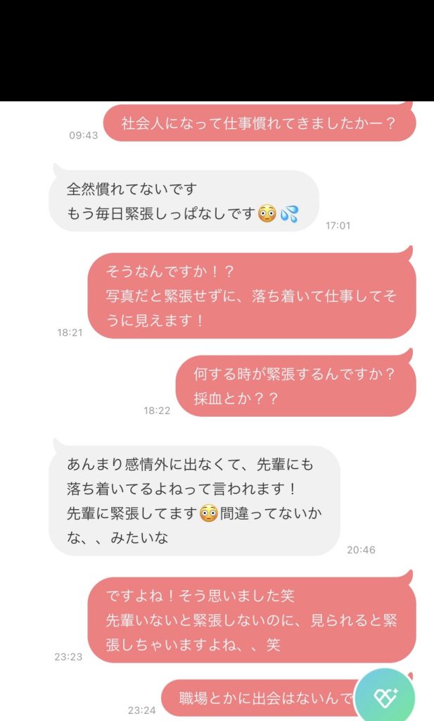 最初の「いいねありがとうございます!」送ったら、女の子からの返信を待たずに続けて質問をする。このケースでは、赤の仕事の話題に関する質問をした。
